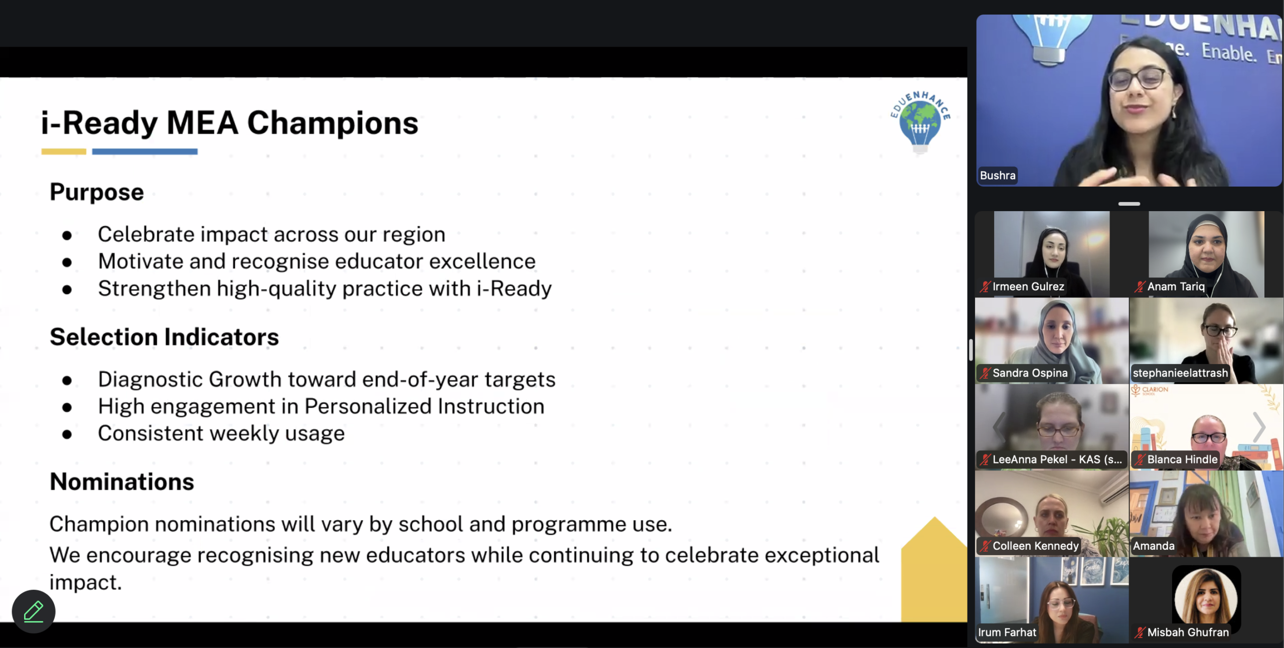 The EduEnhance Champions Regional Leaders Learning Lab is a virtual meet-up created for regional leaders from EduEnhance partner schools using i-Ready, Literacy resources and BRIGANCE across the Middle East, Africa, and Pakistan.